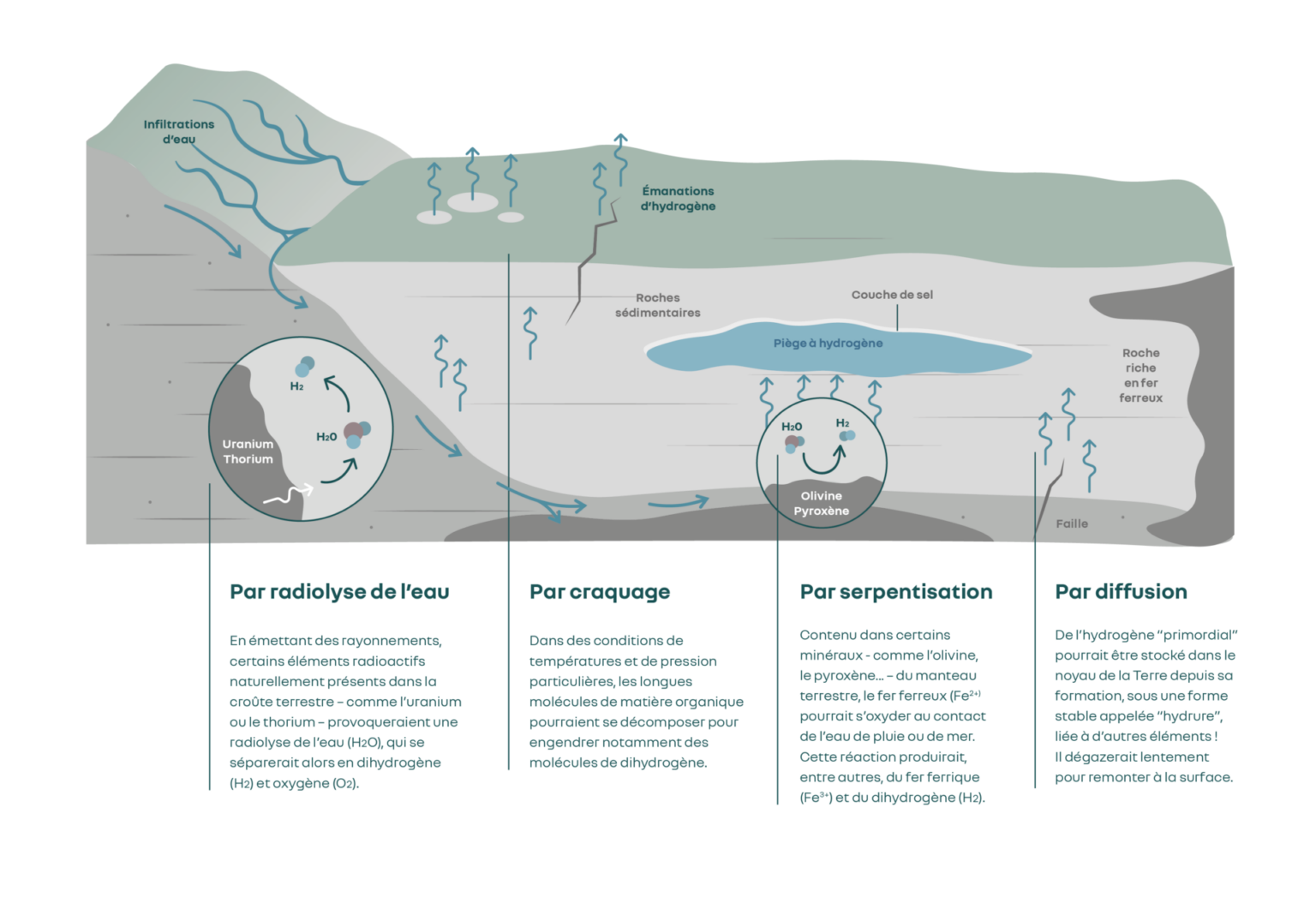 La formation de l'hydrogène naturel résulte de plusieurs mécanismes géologiques actifs: