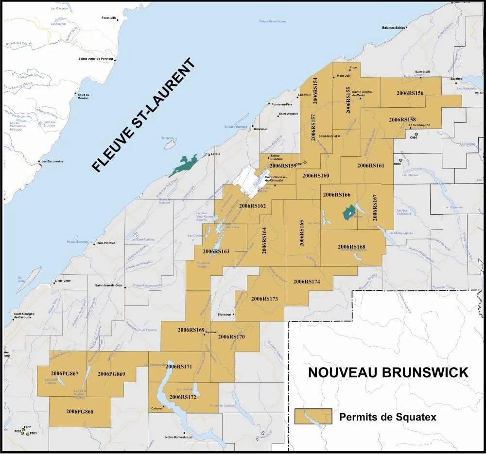 C'est aussi en 2006 que suite aux intérêts grandissants des compagnies pétrolières dans la région des Basses-Terres du St-Laurent pour les dolomies hydrothermales, Squatex s'est bien positionné en faisant l'acquisition d'un domaine minier additionnel important de 12 permis couvrant trois secteurs différents du bassin ordovicien. La superficie totale de ces nouveaux permis couvre 225 370 Ha (voir tableau 2 et figure 2).